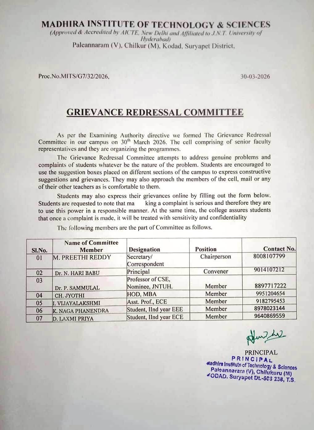 | 02. | Dr. N. HARI BABU | Principal | Convener | 9014107212 |